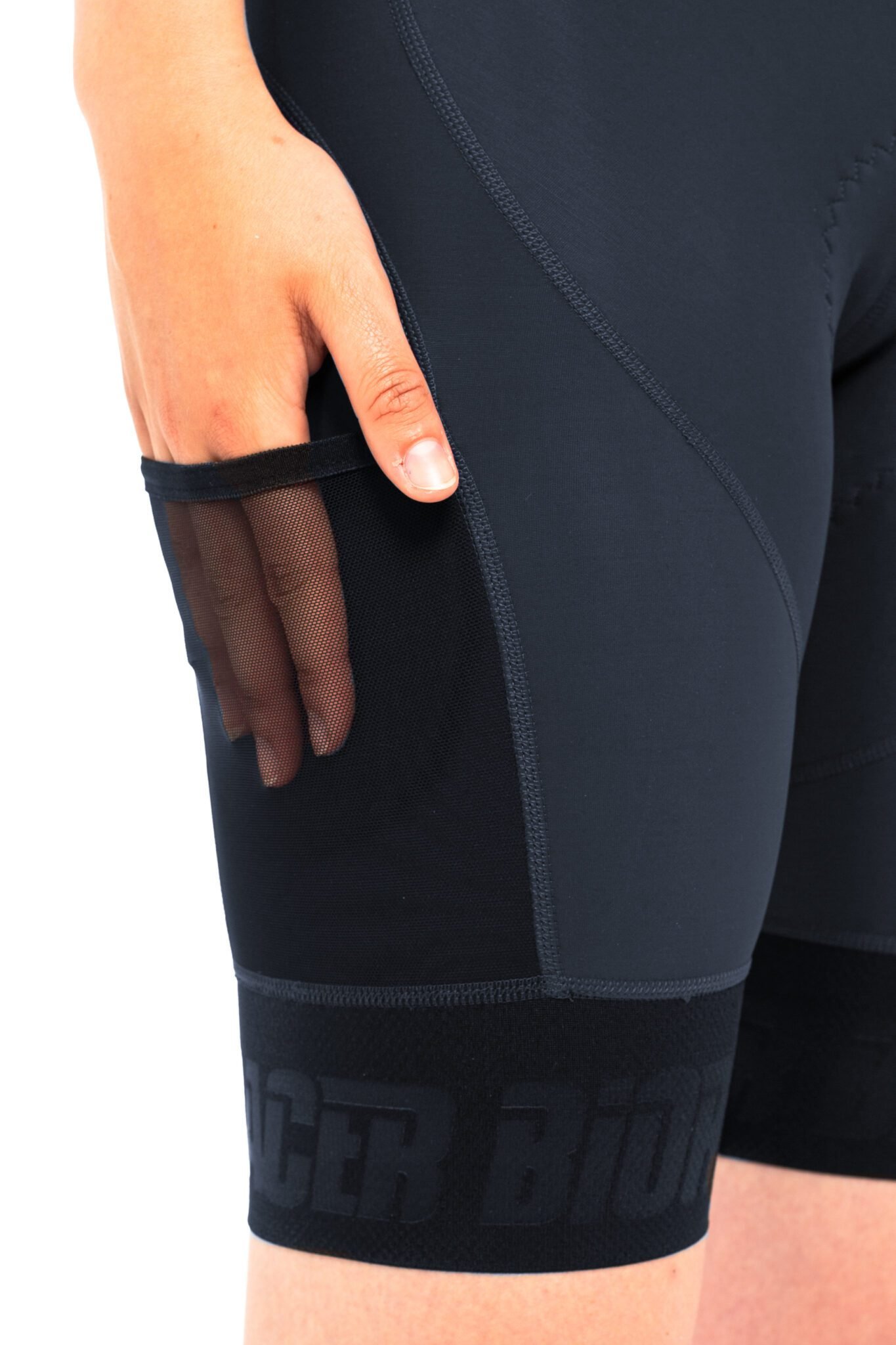 A bib rövidnadrágok egy hálós oldalzsebbel rendelkeznek az egyik lábon.